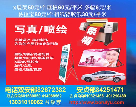 我公司制作易拉寶、X展架、拉網(wǎng)、燈片、燈箱布、網(wǎng)格布、單透、高光相紙、掛軸、車帖等寫真噴繪產(chǎn)品,進(jìn)口機(jī)器制作,質(zhì)優(yōu)價廉,歡迎惠顧!寫真輸出(燈片 全透片 海報背膠 相紙),噴繪輸出(網(wǎng)格布 燈布 車身貼),制作 易拉寶 X架 拉網(wǎng)展架 電腦刻字,KT板,大型活動,及各類展版噴繪,寫真,展板,展架,易拉寶,X展架,,廣告條幅。